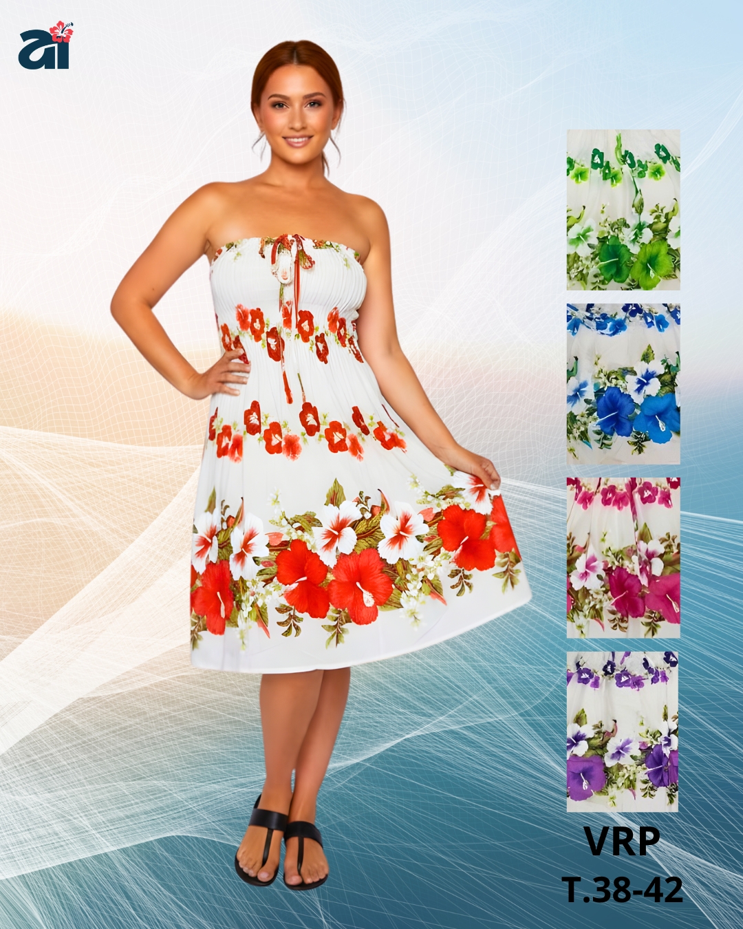 Vestido de rayón plisado en el torso sin tirantes con atractivos estampados en flores de hibisco. Este vestido de rayón es una prenda femenina y elegante que puede ser usada para cualquier ocasión. Confeccionado en un tejido ligero y suave al tacto. Disponible en color blanco y negro combinando con estampados atractivos multicolor para adaptarse a cualquier gusto.